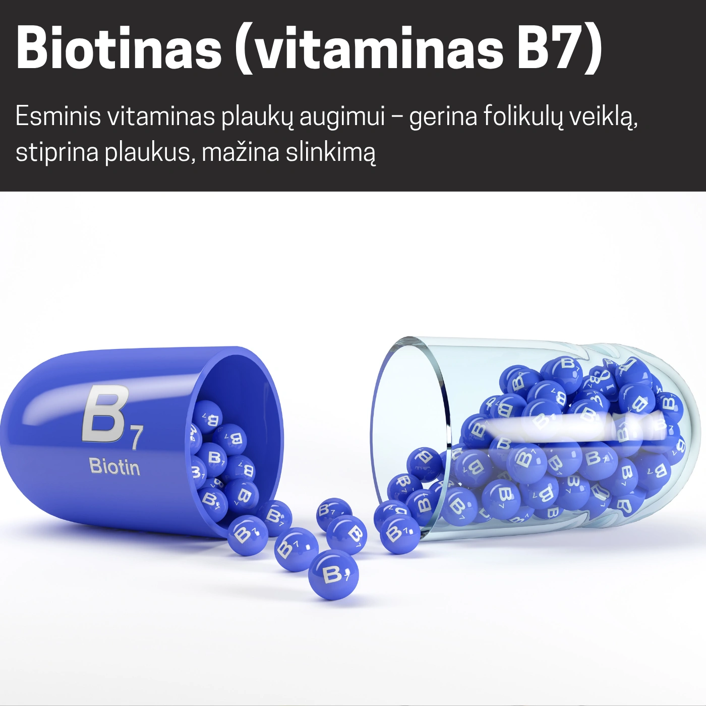 | Biotinas (vitaminas B7) - esminis vitaminas plaukų augimui – gerina folikulų veiklą, stiprina plaukus, mažina slinkimą | ![]() |