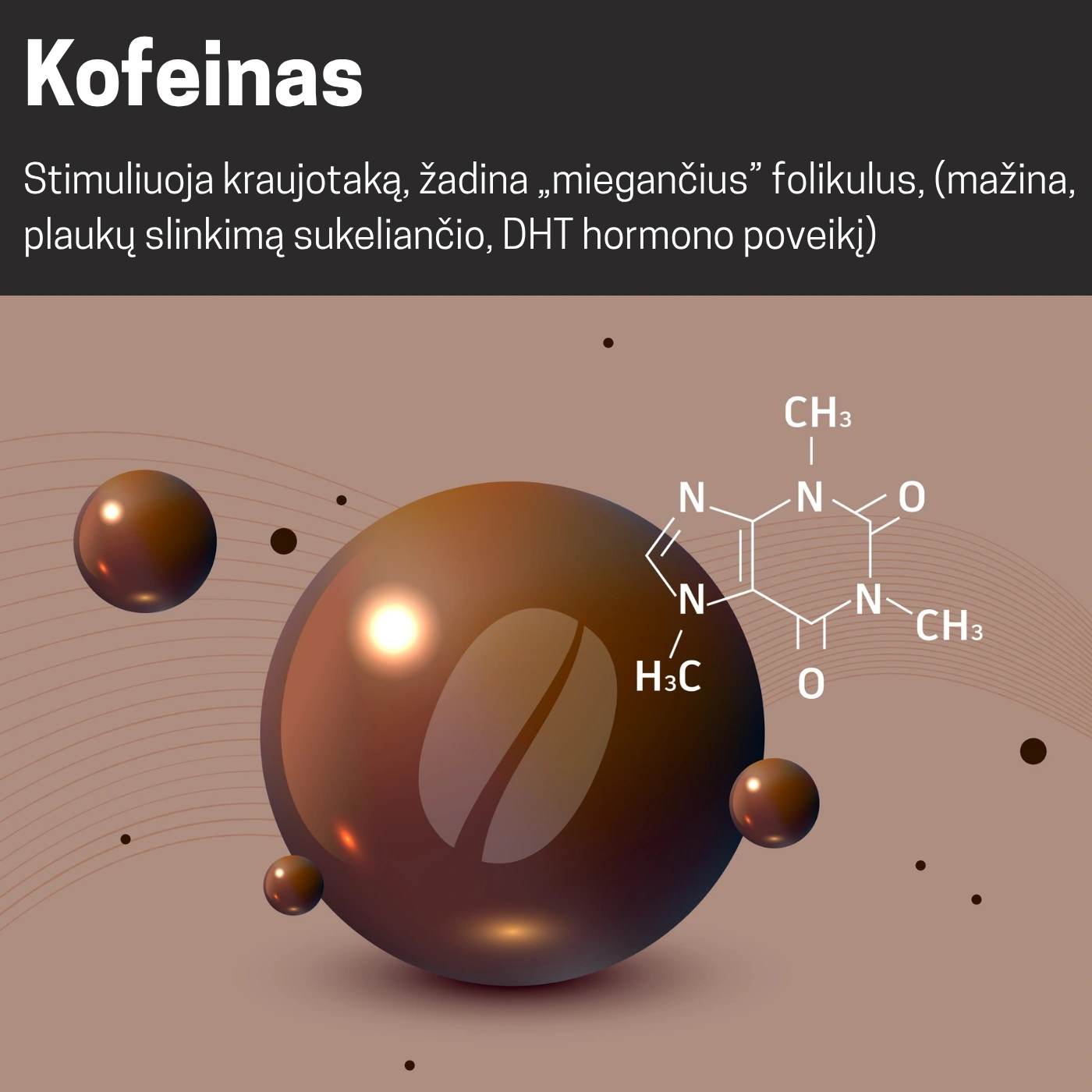 | Kofeinas - stimuliuoja kraujotaką, žadina „miegančius” folikulus, (mažina, plaukų slinkimą sukeliančio, DHT hormono poveikį) | ![]() |