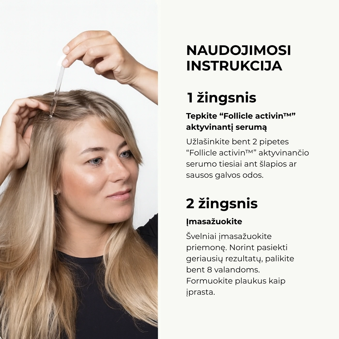 Follicle Activin losjonas (60 ml): Ant drėgnų plaukų užlašinkite 2 pipetes lašus serumo. Švelniai įmasažuokite į visą galvos odą. Palikite veikti. Nereikia nuskalauti.