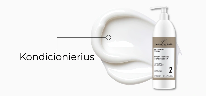 Kondicionierius (1000ml): Aqua (Water), Cetearyl Alcohol, Behentrimonium Chloride, Propanediol, Dimethicone, Cetyl Esters, Shea Butter Ethyl Esters, Rosmarinus Officinalis Leaf Extract, Mentha Piperita (Peppermint) Leaf Extract, Biotin, Inositol, Glycerin, Retinol, Aesculus Hippocastanum Seed Extract, Rosa Moschata Seed Oil, Zea Mays Oil, Phenoxyethanol, Parfum, Polymide-1, Caprylyl Glycol, Isopropyl Alcohol, Calcium Pantothenate, Tocopheryl Acetate, PEG-20 Castor Oil, Alcohol Denat., Citric Acid, Potassium Sorbate, Sodium Benzoate, Benzyl Salicylate.