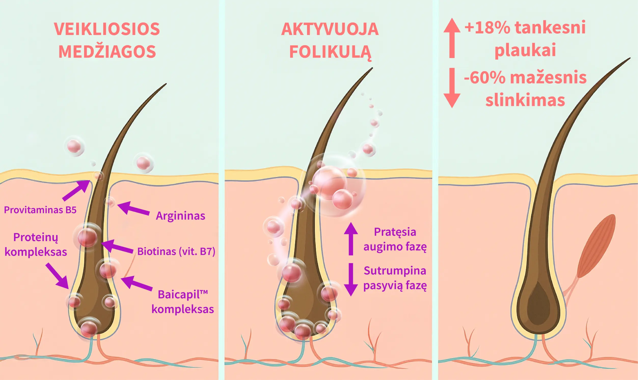 - Baicapil™ kompleksas padeda atkurti pažeistus plaukų folikulus. Tyrimais patvirtinta, kad iki 60% sumažėja plaukų slinkimas, bei 18 % padidėja plaukų tankumas